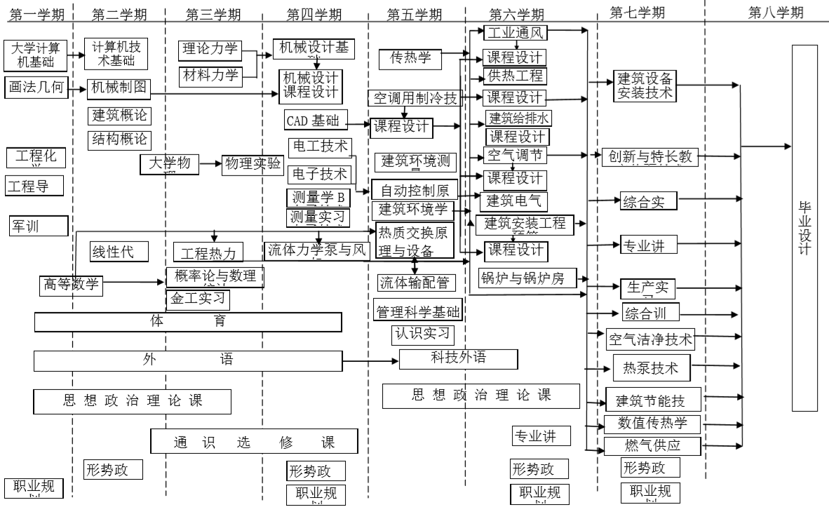 毛泽东思想和中国特色社会主义理论体系概论,体育,高等数学,工程热力学,机械设计基础,电工技术,电子技术,流体力学泵与风机,传热学,建筑环境学,热质交换原理与设备,流体输配管网,空调用制冷技术,供热工程,工业通风,空气调节。