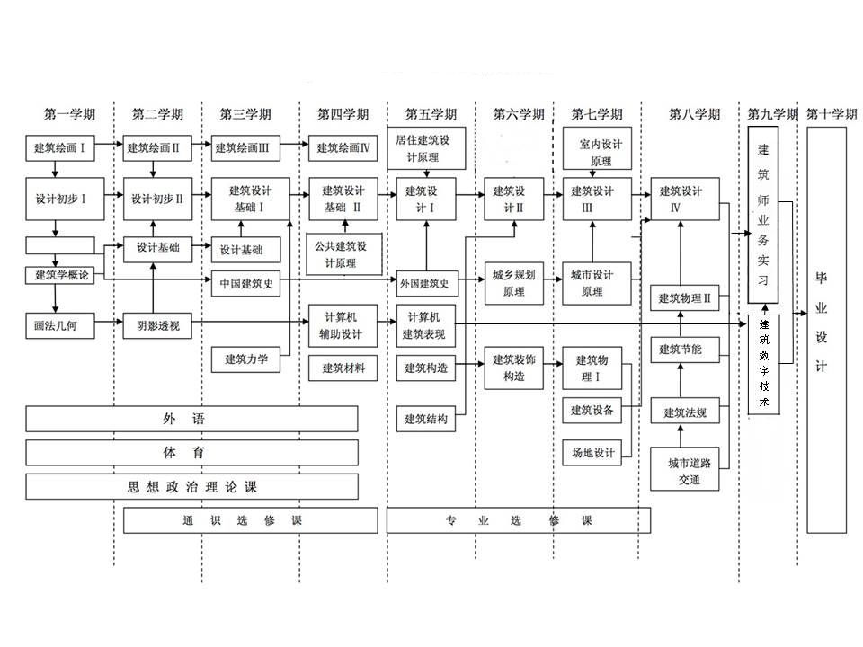 了解社会主义民主与法制、法律与法规、计算机技术与文化、文学、美术、力学等基础理论知识和技法。掌握马克思主义、毛泽东思想和邓小平理论的基本原理;掌握建筑设计、城市设计、中外建筑发展史等理论,掌握建筑材料及性能合理选用、建筑构造,建筑结构性能设计知识和方法。掌握应对特殊环境条件下的建筑设计理论和方法,掌握建筑特种构造设计的原理和方法、方案设计和技术施工图设计的要求和方法等一系列专业知识和技能。了解建筑师职业特点和职业道德。在体育方面要求养成科学锻炼身体的习惯,达到大学生体育合格标准。