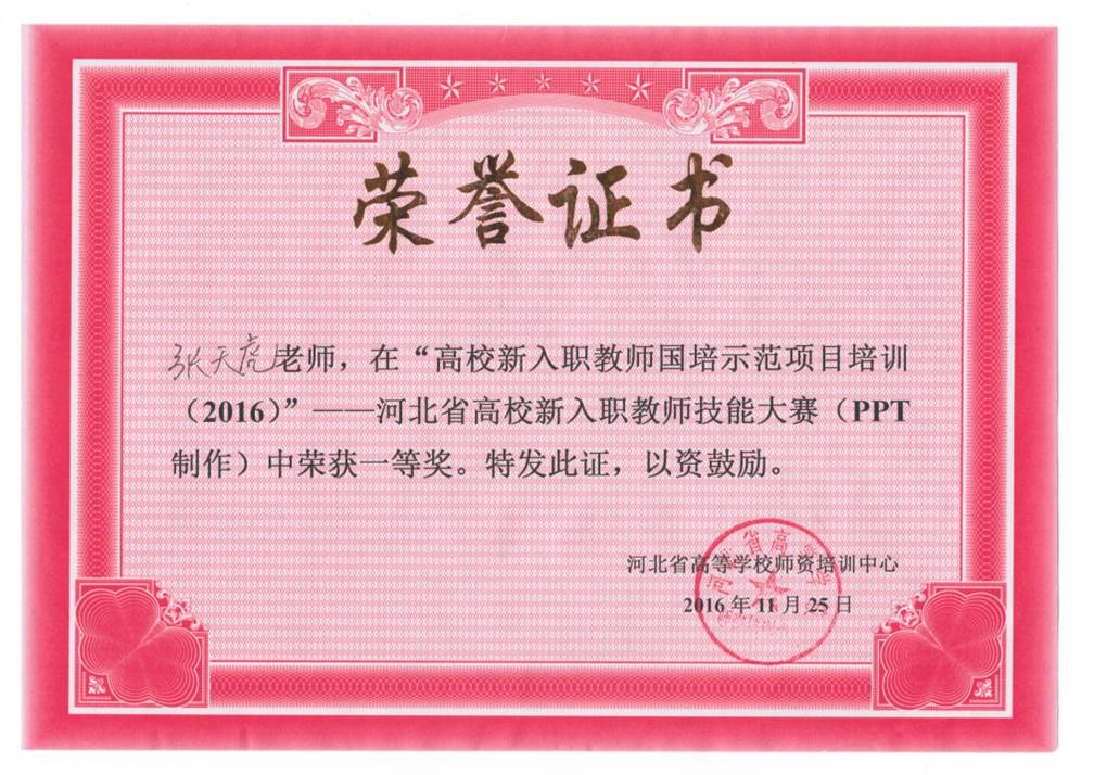 教育厅组织的高校新入职教师国培示范项目培训中获得了PPT制作一等奖。自2018年学校推广使用线上教学平台起,他又参加了教务处以及超星公司开展的多次培训,完成了多门课程的线上建设,并获得了91在线