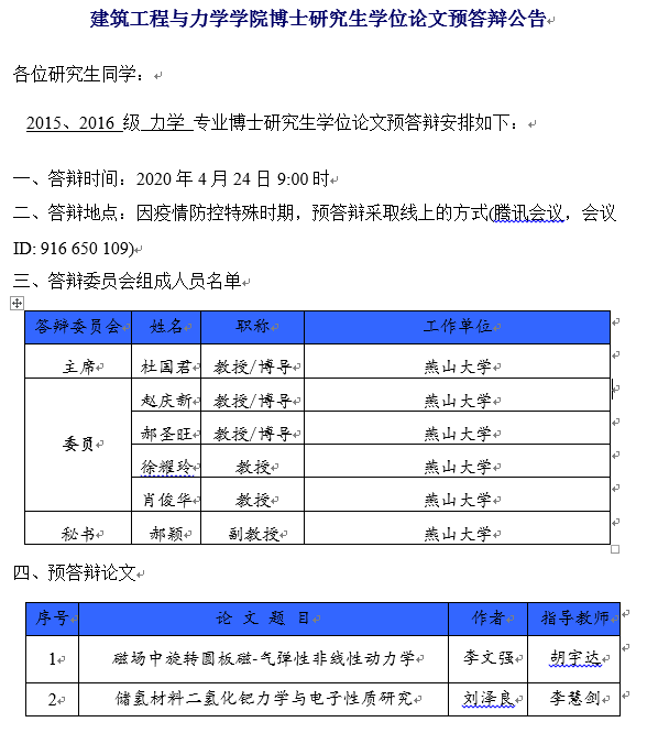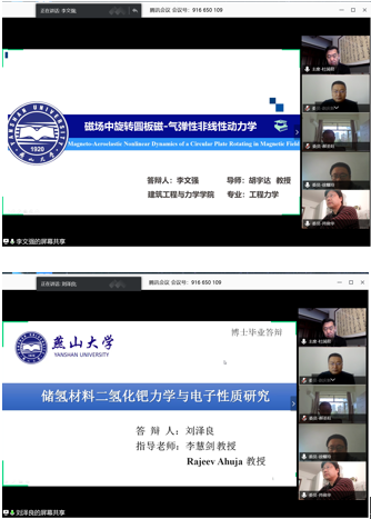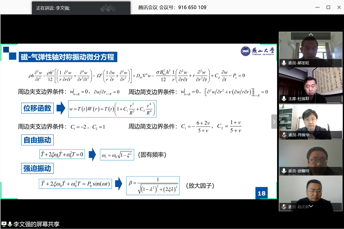 和工程力学系的精心准备,4月24日上午9点视频答辩会准时开始。正式答辩过程中,答辩人阐述论文、评委质询、答辩人回答问题、委员投票和评议,流程与线下答辩完全一致,各个环节紧张有序。经过近三个小时的视频答辩和会议讨论,李文强和刘泽良两位研究生顺利通过了博士学位论文预答辩。最后,答辩委员会主席杜国君教授宣读预答辩决议,本次预答辩在掌声中圆满结束。