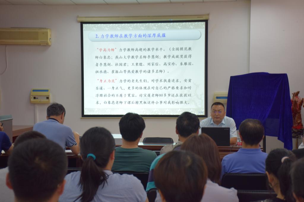 赵庆新老师以“师德内涵”开篇,通过讲述自己参加工作以来亲身经历的一个个建工故事,鲜活地呈现出力学教师在教学方面一直传承的严谨求实的优良传统。通过教师对教学的完美追求、对学生的无私关爱、老教师对青年教师的悉心指导三个方面,阐述了建工人为91在线 发展默默付出,用自己实际行动讲好建工故事的精神品质。最后号召系主任带好队伍,鼓励教师潜心教学,共同发展,统一在师德与专业发展的最大公约数下,形成一个活力四射的集体。