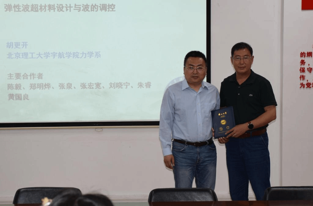 讲席教授、国家自然科学基金委重大项目和创新研究群体负责人、国家自然科学基金委杰出青年基金获得者胡更开教授在建筑馆211作了题为“弹性波超材料设计与波的调控”的学术报告。讲座前,院长赵庆新为胡更开教授颁发了客座教授聘书。讲座由副院长郝圣旺主持,青年教师和研究生代表聆听了讲座。