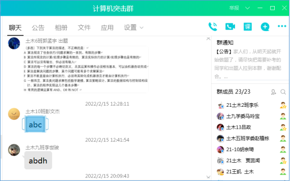 每日一题,一日一练,业精于勤。针对高等数学、工程化学、大学计算机等科目,由学委牵头,号召成绩优秀的学生担任辅导志愿者,共成立了8个线上学习小组。每日上午在群内发送当日习题,补考同学完成作业后并提交打卡,晚上群内公布习题答案。同学们在群里进行提问、交流,在讨论中加深对知识的理解,弥补知识漏洞。截至目前,每日一题活动覆盖132人次,累计出题198道。此活动帮助补考同学在假期养成了坚持学习的习惯,为开学后顺利通过补考奠定基础。