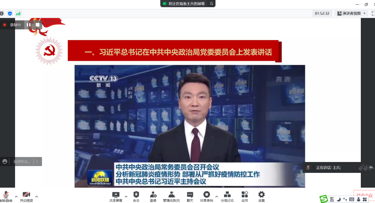 党委以腾讯会议形式线上召开春季学期第一次党委中心组学习会,专题学习习近平总书记3月17日在中共中央政治局常务委员会上关于疫情防控的重要讲话精神。91在线