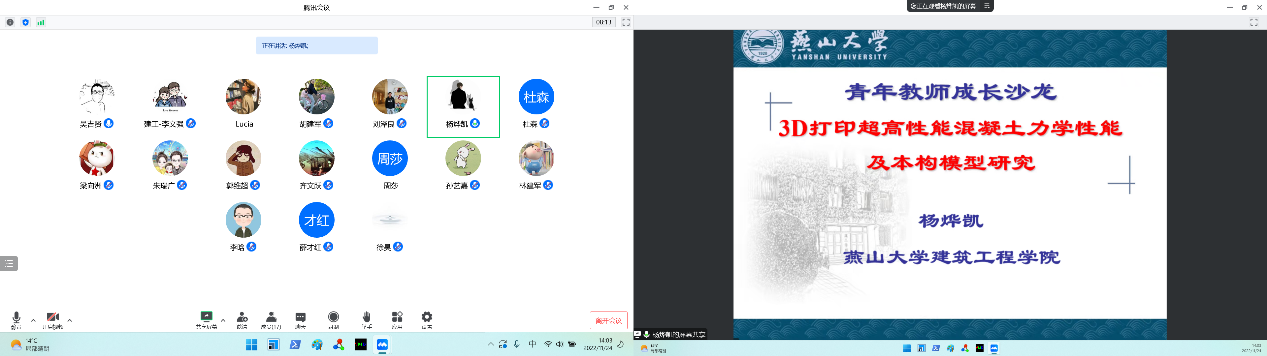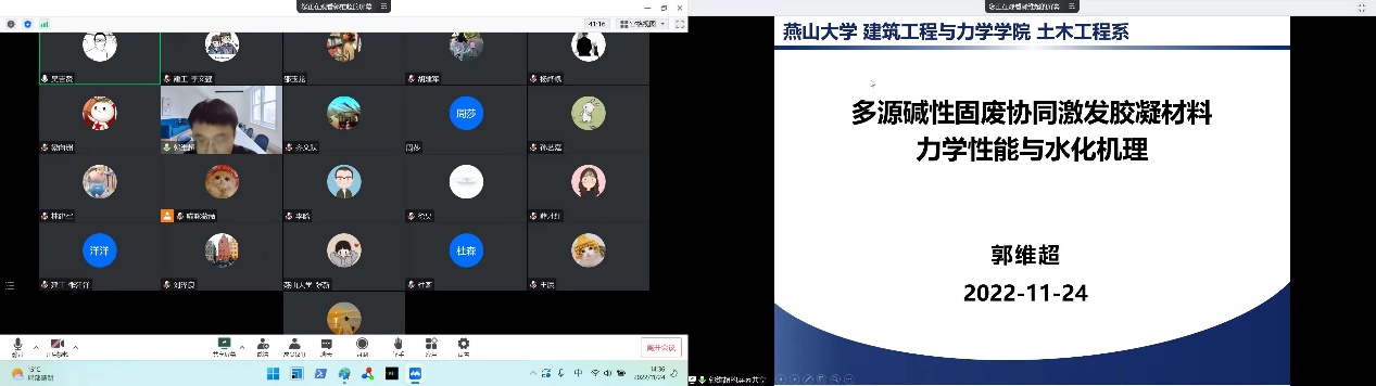 课题分享。杨烨凯老师对3D打印超高性能混凝土力学性能及本构模型相关研究成果进行了分享。杨老师描述了3D打印UHPC材料静态和动态力学性能的强度变化规律,揭示了3DP-UHPFRC的静态力学各向异性机理,并介绍了根据空间变换张量理论建立适用于3DP-UHPC的各向异性压缩本构模型的方法。郭维超老师分享了多源碱性固废协同激发胶凝材料的力学性能与水化机理。面对建材工业低碳绿色发展与大宗工业固废资源化利用的重大需求,郭老师介绍了碱渣、电石渣等碱性固废建材应用的技术瓶颈,提出了以废治废、类中药配伍相须相使的思想,开发了系列全固废胶凝材料体系并揭示了水化机理,在无筋制品领域实现了全替代水泥使用并逐步推进产业化应用。