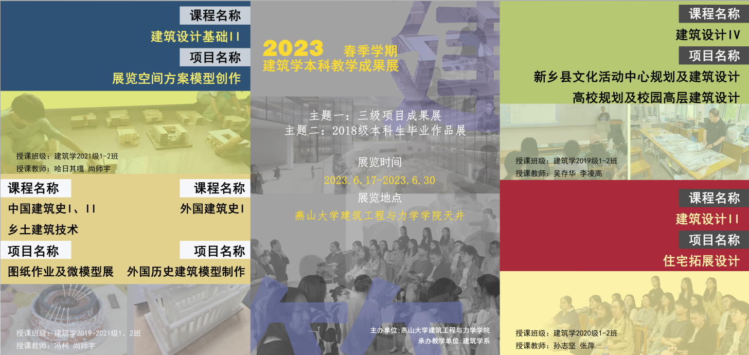 为了展示建筑学专业的教学成果,加强全校学生的美育培养,建筑系于6月17日-6月30日在建筑馆天井举办了2023年春季学期建筑学本科教学成果展。