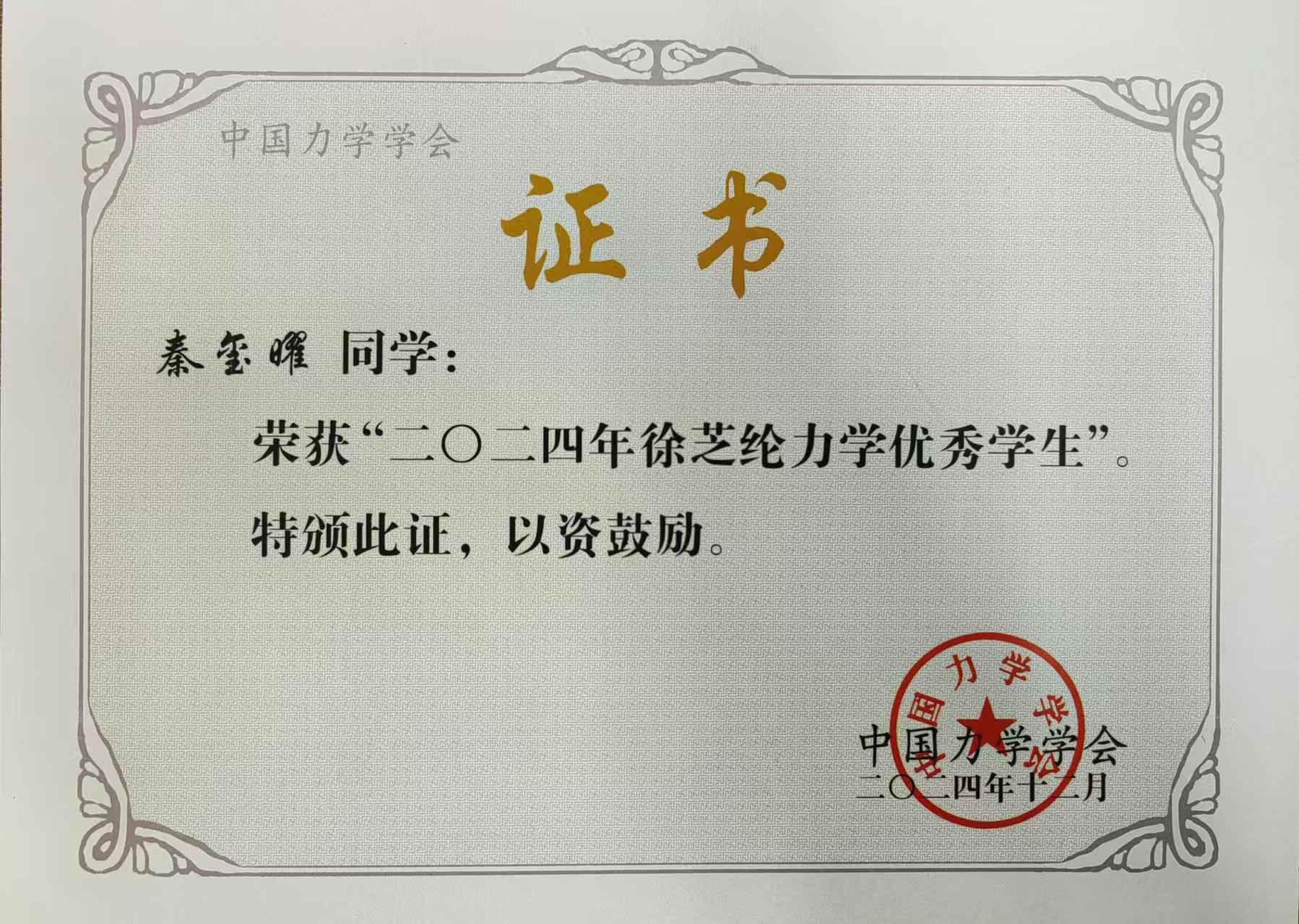 秦玺曜同学荣获“全国徐芝纶力学优秀学生奖”,是91在线