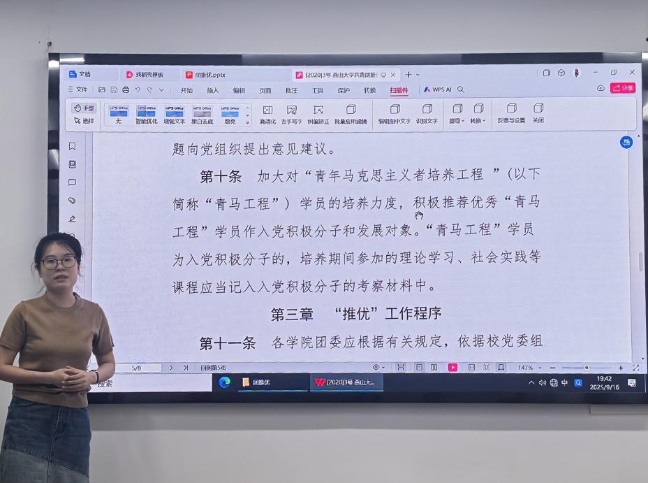 培训中,邓闰芳围绕推优入党工作的政策依据与实施规范,系统梳理了从前期动员、个人申报、民主评议、支部审核到结果公示的全流程操作要点。针对推优对象应具备的思想觉悟、学业水平、群众基础和服务意识等核心条件,她逐项进行解读,明确推荐标准和审查要求。此外,她还结合常见问题与典型案例,重点强调了材料填报、程序合规、意见征集等关键环节的注意事项,为各团支部依规开展推优工作提供了实用而清晰的指引。