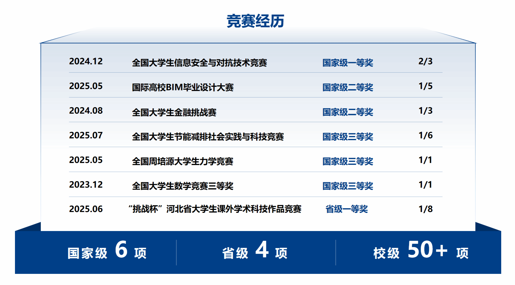 在学科竞赛的舞台上,他同样光芒初绽。从全国大学生信息安全与对抗技术竞赛一等奖,到周培源力学竞赛、国际高校BIM设计大赛等赛事中的多项国家级奖项,三年来,他累计获得国家级奖项6项、省级4项、校市级50余项。每一次备赛都是对专业知识的深化,每一次合作都是对团队精神的锤炼。他以赛促学、在实践中锻造创新能力,逐步完成了从课堂到赛场、从理论到实战的跨越。