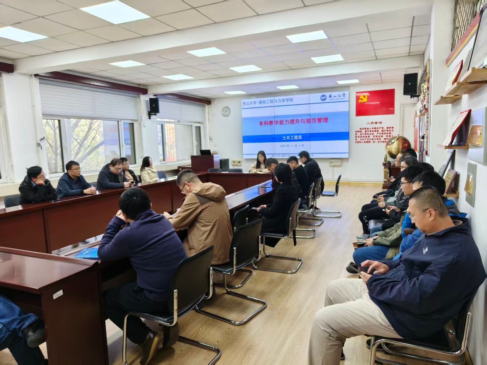 土木工程系在系会议室召开全系教师教学工作专题会议。会议由系主任李雨浓教授主持,副主任杨烨凯、吴吉贤、陈正心及全体教师参加。本次会议紧紧围绕"人工赋能智慧课程建设"主题展开,深入分析当前教学工作面临的新形势新要求。